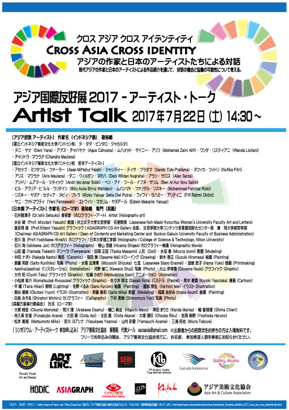 2017年7月22日(土)-23日(日)東京,エコ・ギャラリー新宿にて,《アジア国際友好展2017》が開催された。本展覧会は,≪クロス・アジア・クロス・アイデンティティ≫をメインテーマとし,インドネシアと日本のアーティスト,そして,大学・教育機関に所属する両国の講師と学生らの作品およそ130点が会場内に展示された。本年度は,インドネシア舞踊のオープニングから開始し,シンポジウム,アーティスト・トーク,インドネシア伝統美術文化体験ワークショップ,ワンピ―ス・コラボレーションが行われ,アジアと日本のアーティストたちによるコラボレーション展示と美術文化交流イベントが実施された。